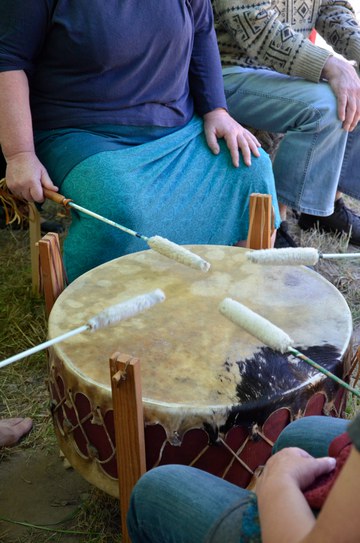 Eine Gruppe von Menschen steht um eine große Trommel, vier davon trommeln, immer im Wechsel. Wir singen dazu kraftvolle Lieder der Ureinwohner aus Nordamerika.